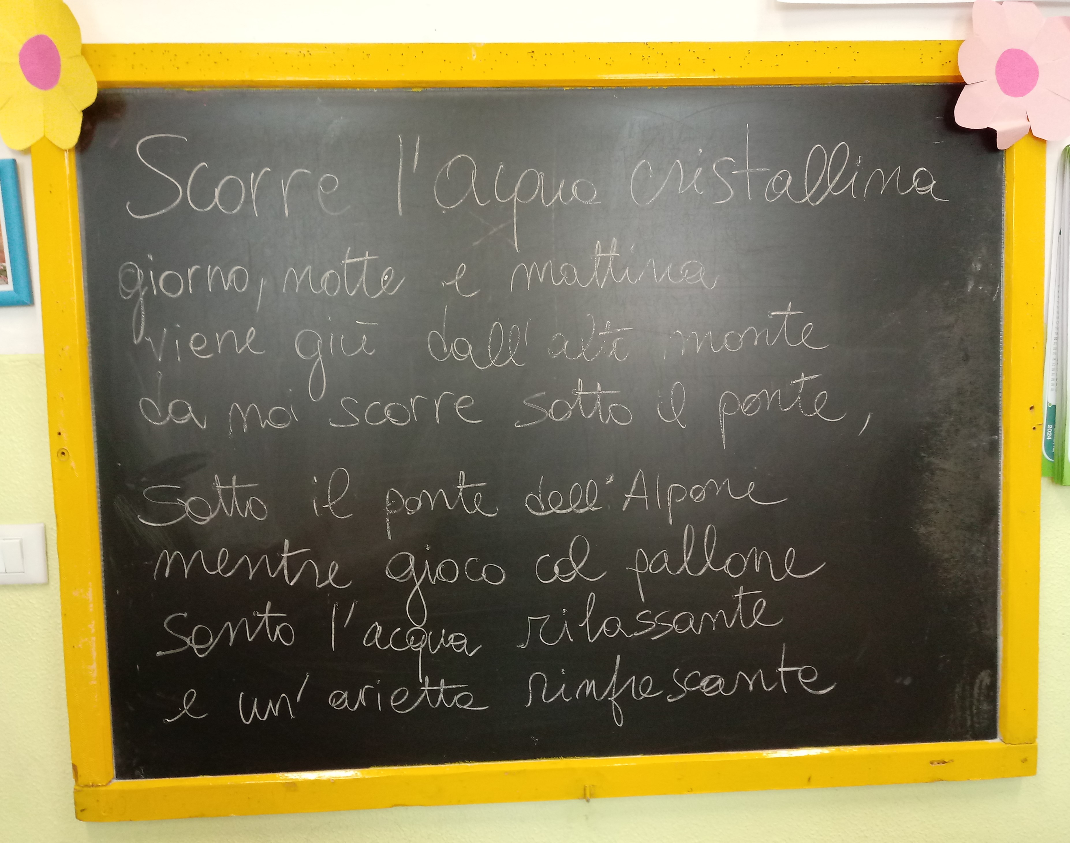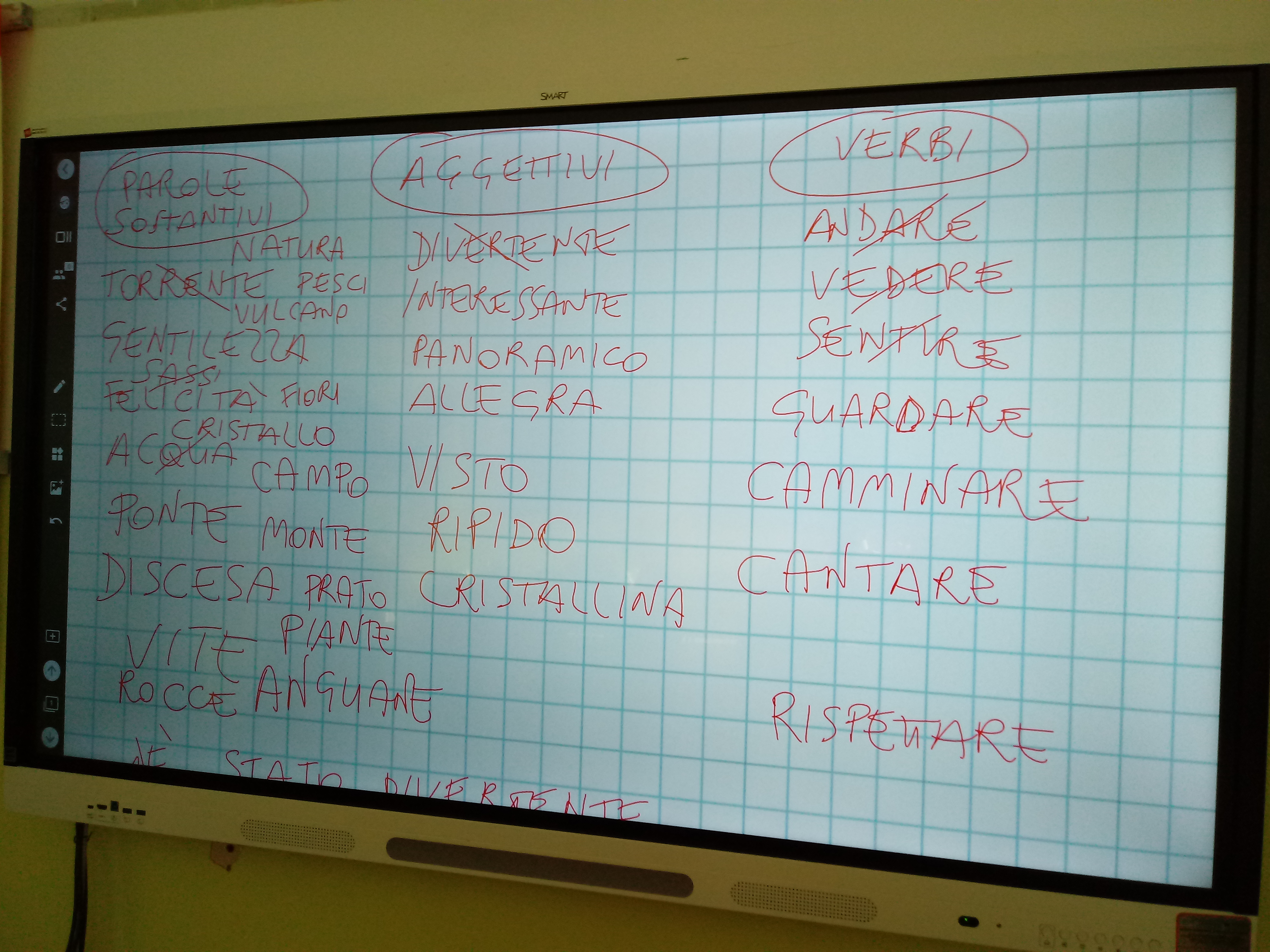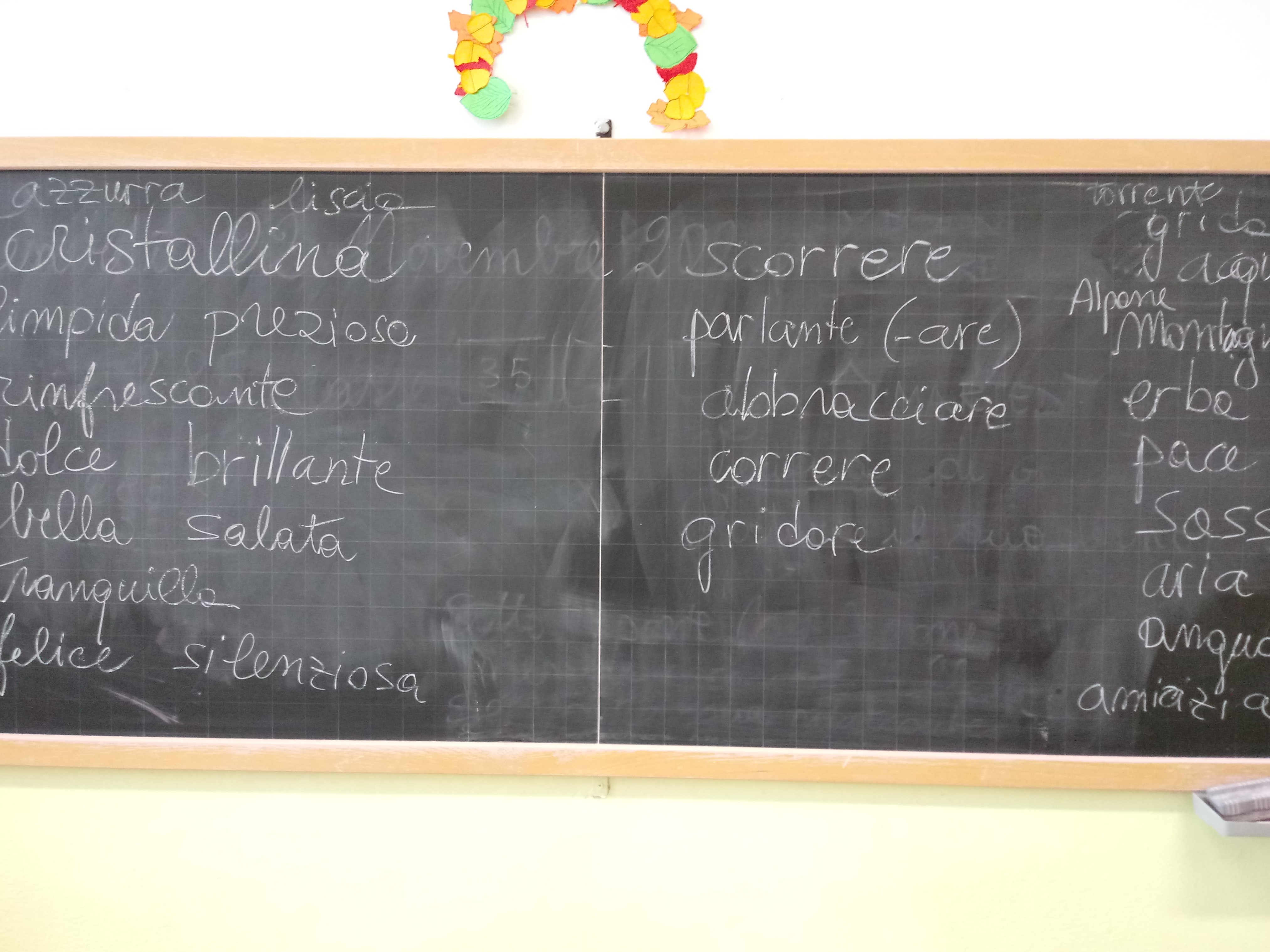 Con l’esperta hanno dapprima percorso luoghi naturali suggestivi e caratteristici del paese in cui abitano. Successivamente, li hanno descritti in una serie di parole, aggettivi, verbi, annotati sulla lavagna, così da favorire, mentalmente, il processo di ricordo e rielaborazione dell’esperienza.