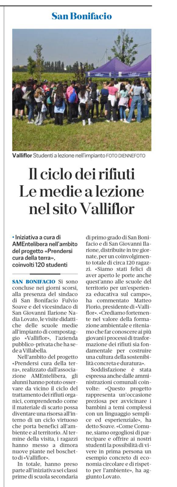In collaborazione con le amministrazioni del Comune di San Giovanni Ilarione e di San Bonifacio e la direzione dell'azienda Valliflor srl sono state organizzate da AMEntelibera ETS alcune visite in azienda. I ragazzi e le ragazze delle classi prime delle scuole sec. I grado Marcazzan e Bonturi hanno visitato l'impianto e grazie alla guida dell'ing. Stella approfondito il suo funzionamento.